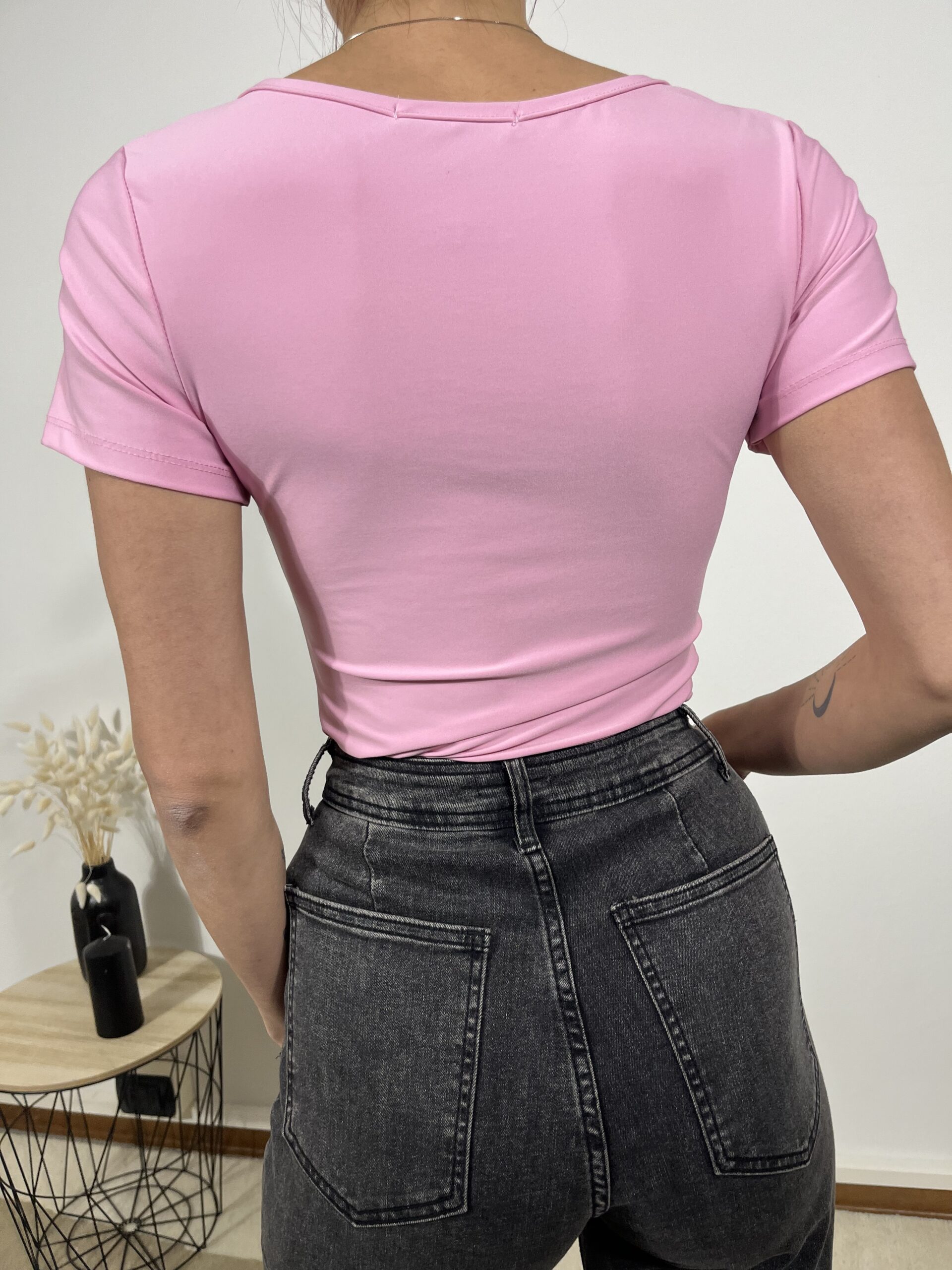 Body rosa a maniche corte con scollo quadrato, semplice ma super femminile.