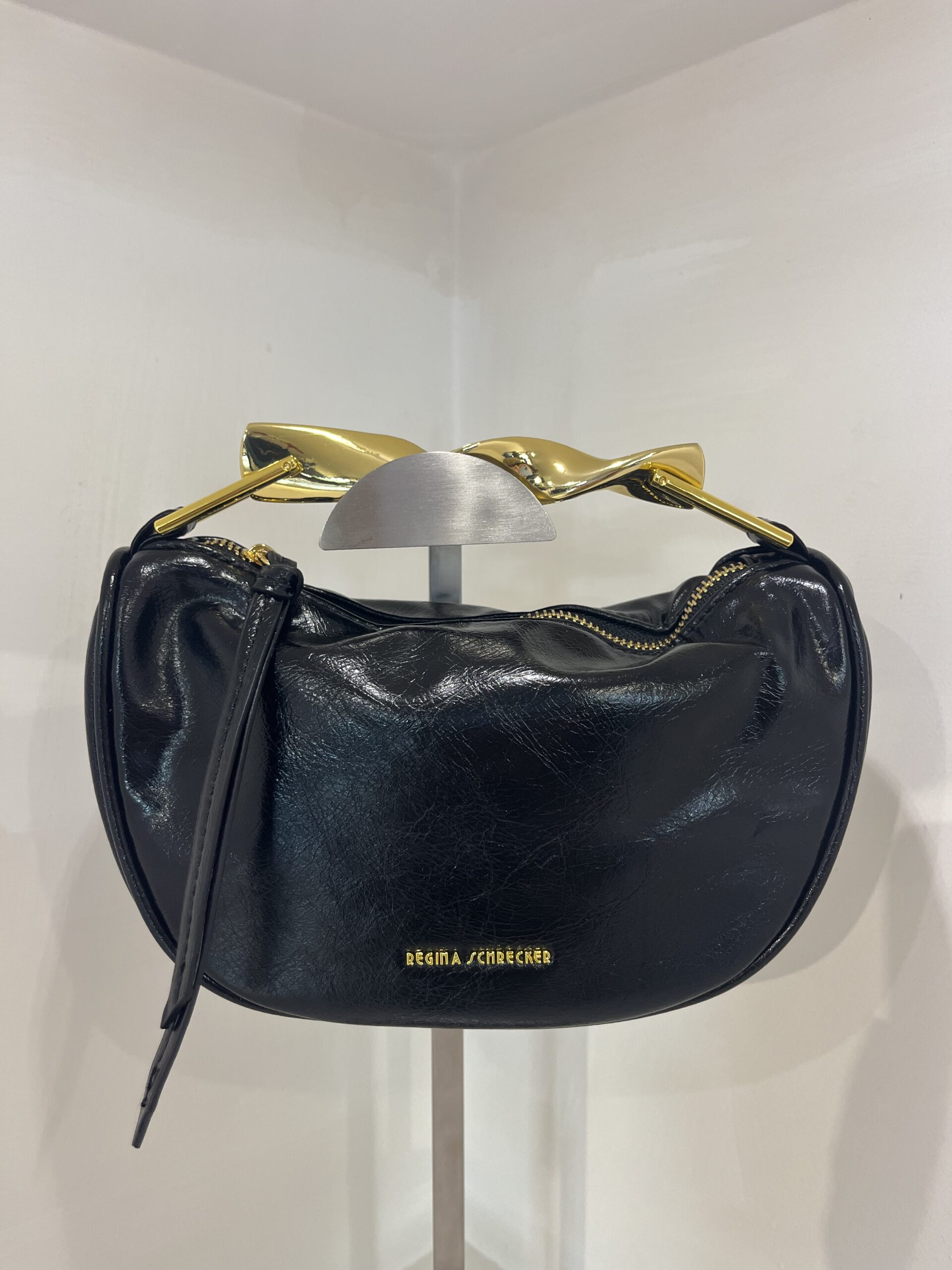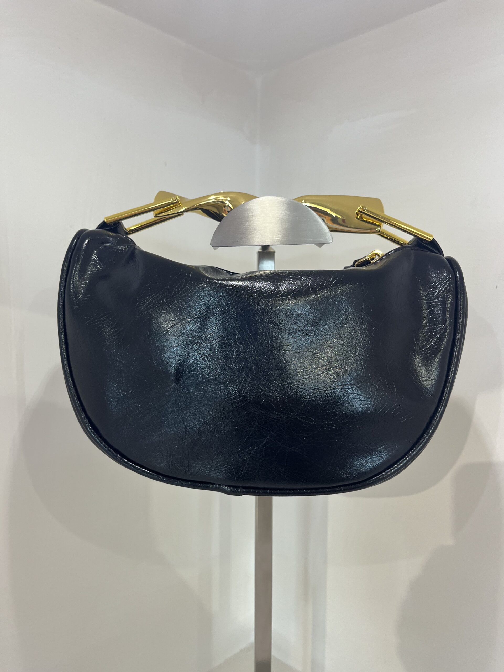 Borsa nera in ecopelle con manico in ferro e tracolla, compatta ed elegante.