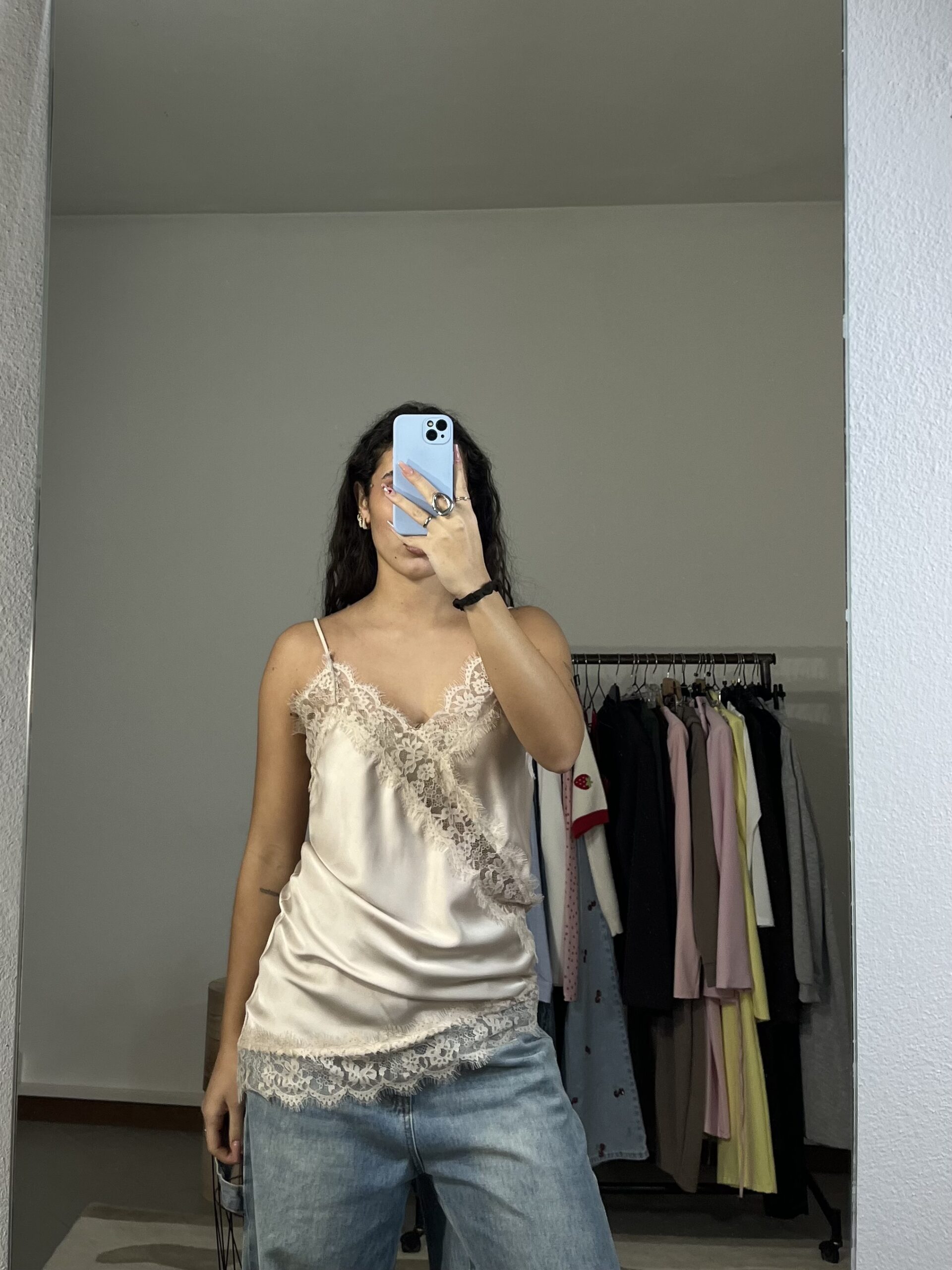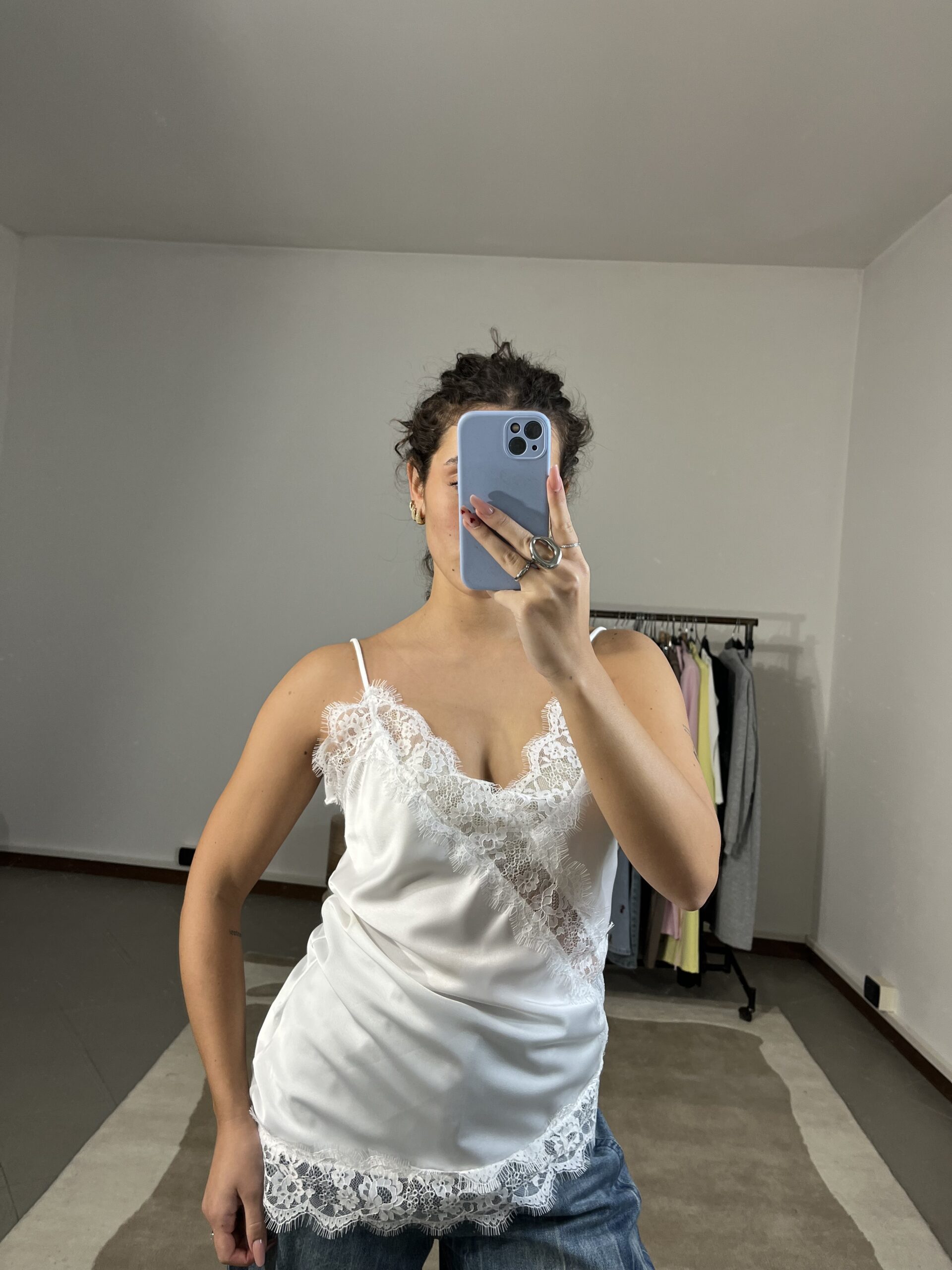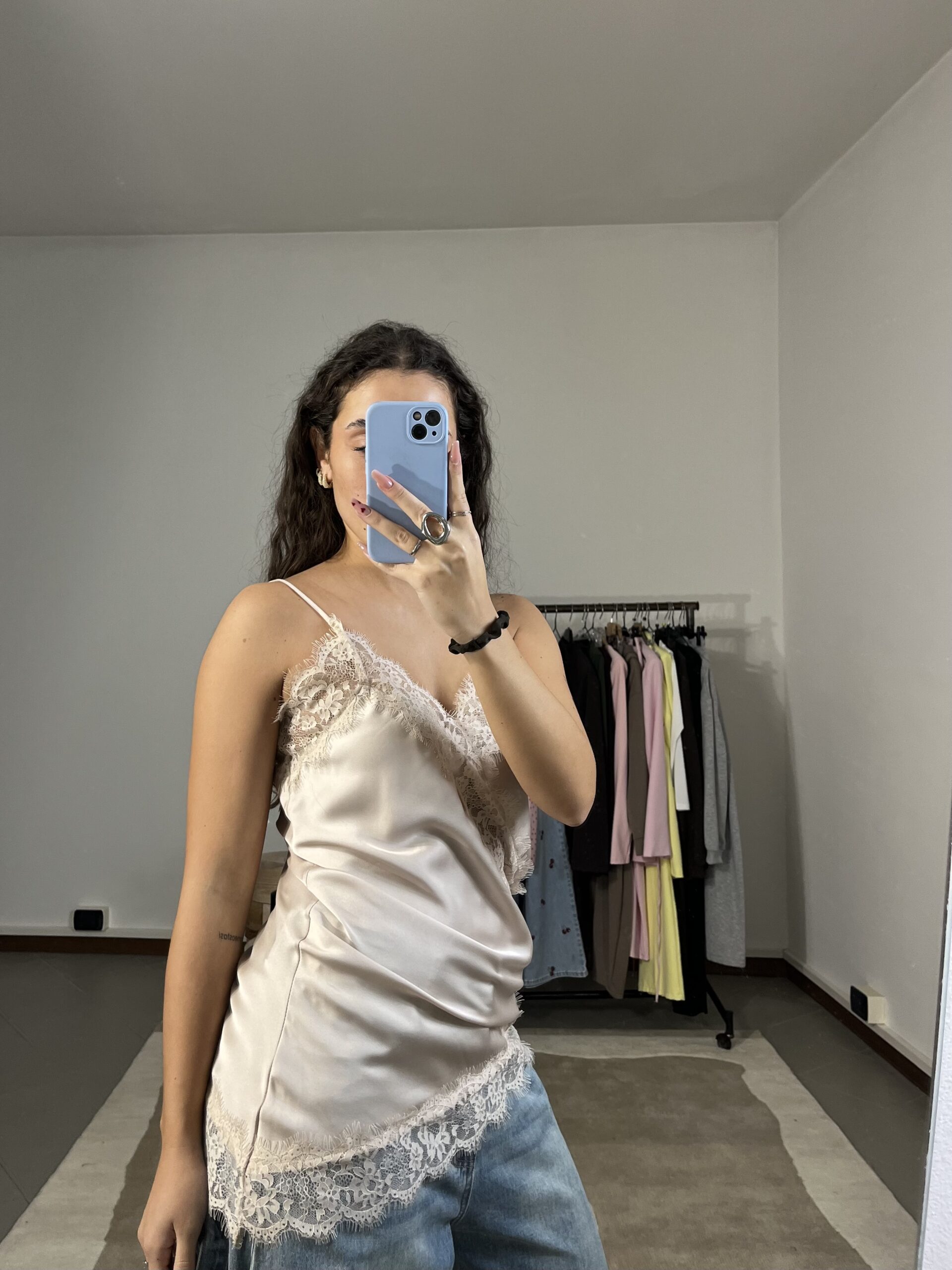 Canotta asimmetrica in satin con dettagli in pizzo, elegante e femminile.
