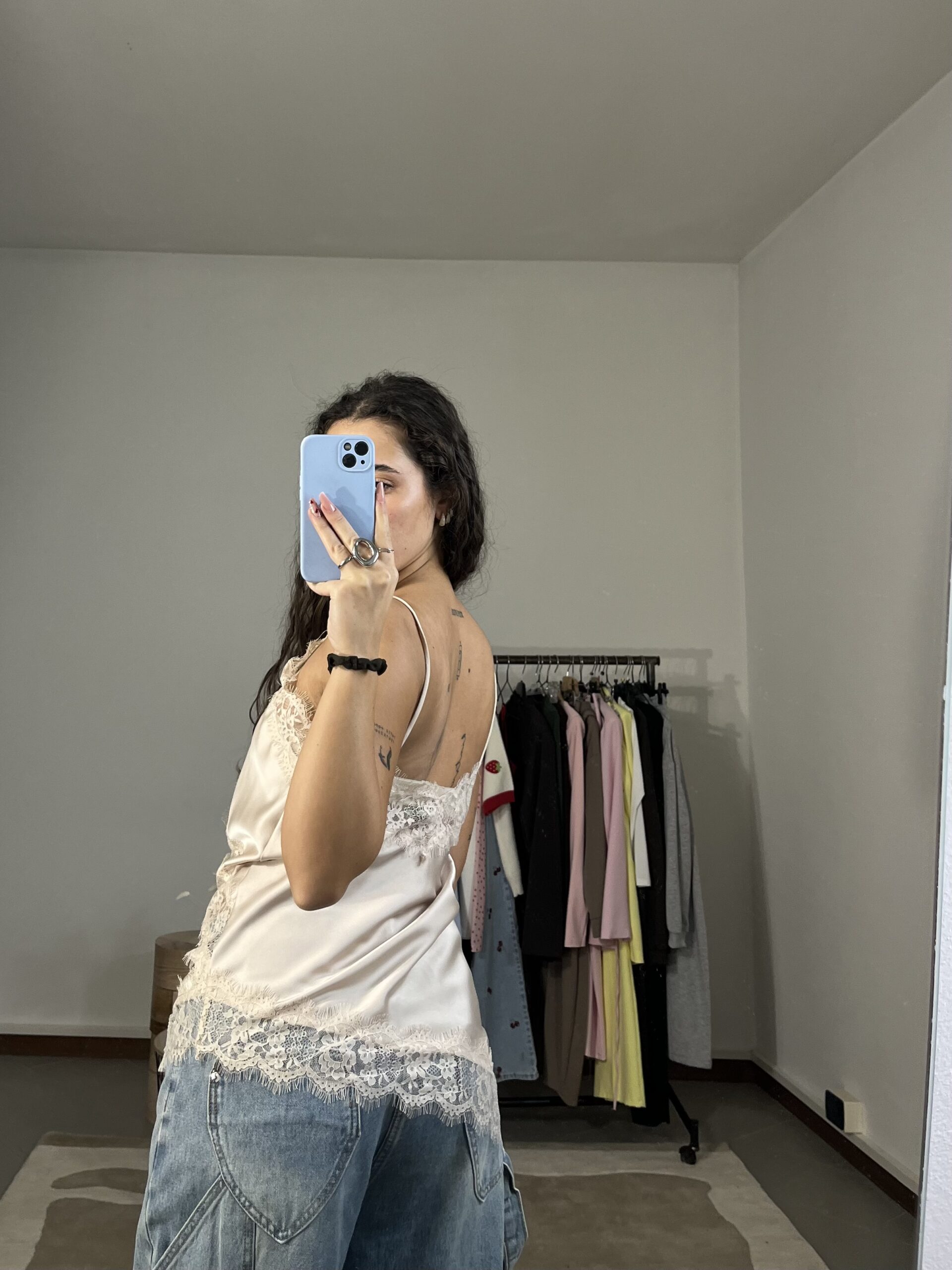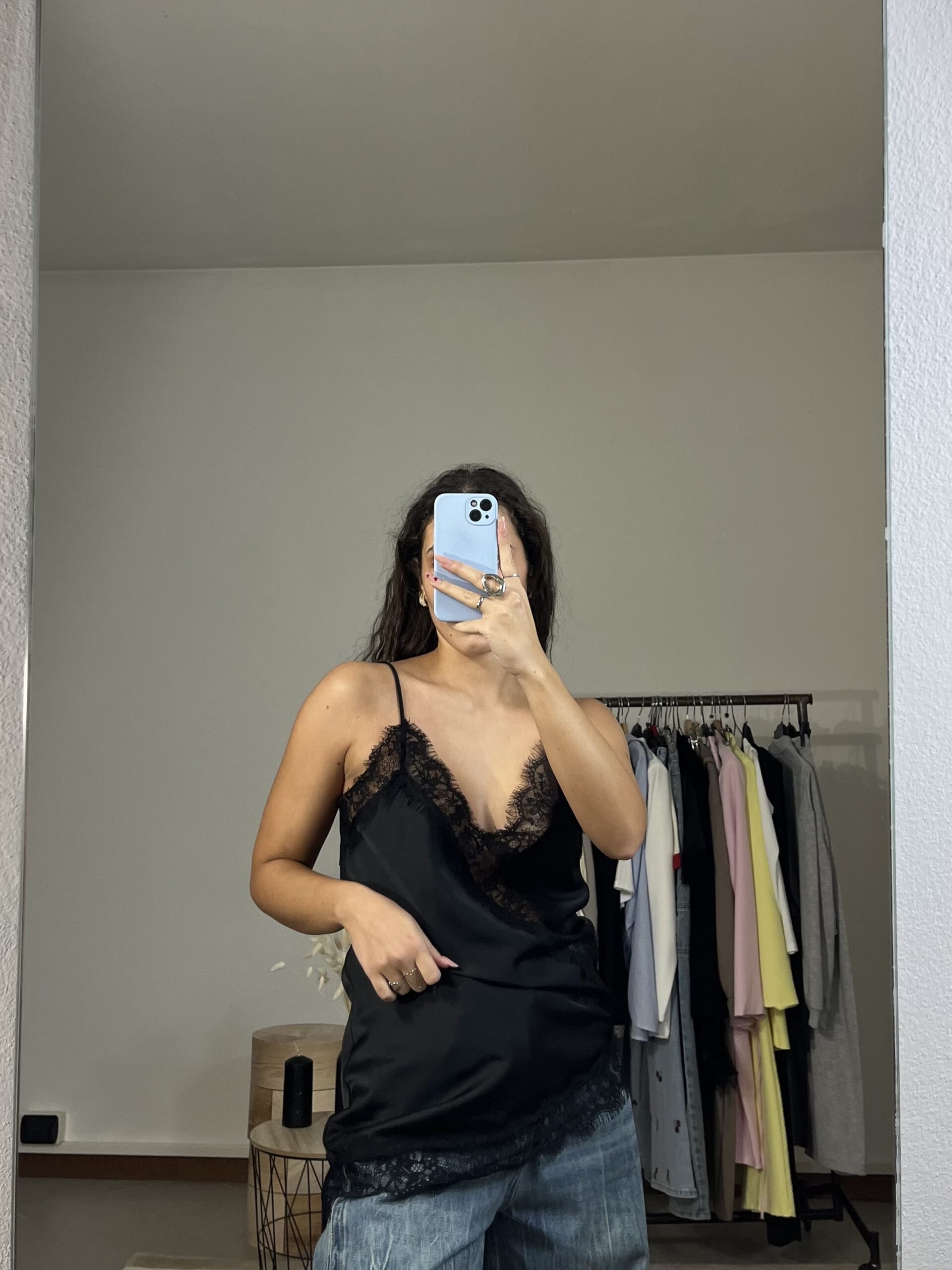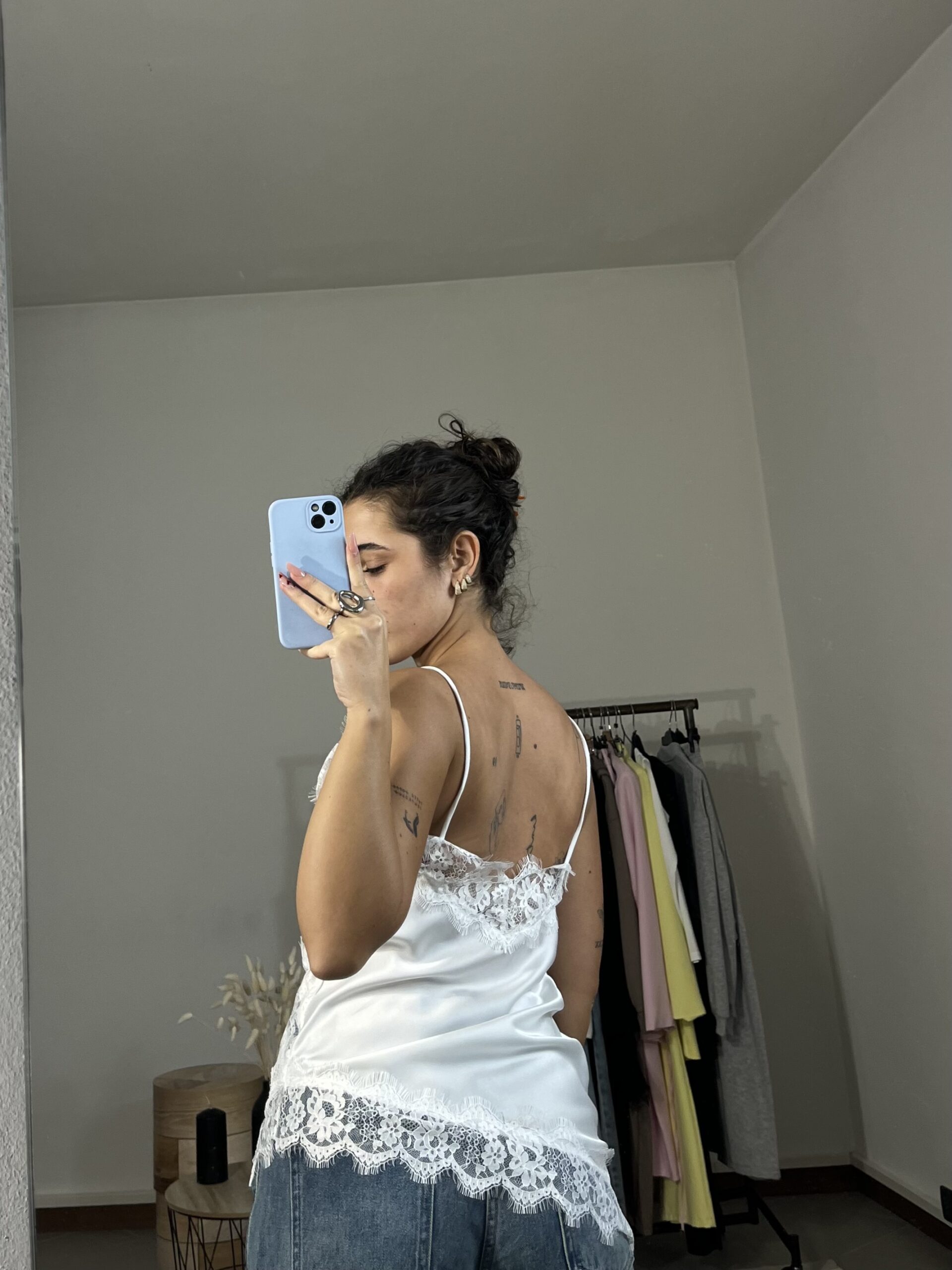 Canotta asimmetrica in satin con dettagli in pizzo, elegante e femminile.