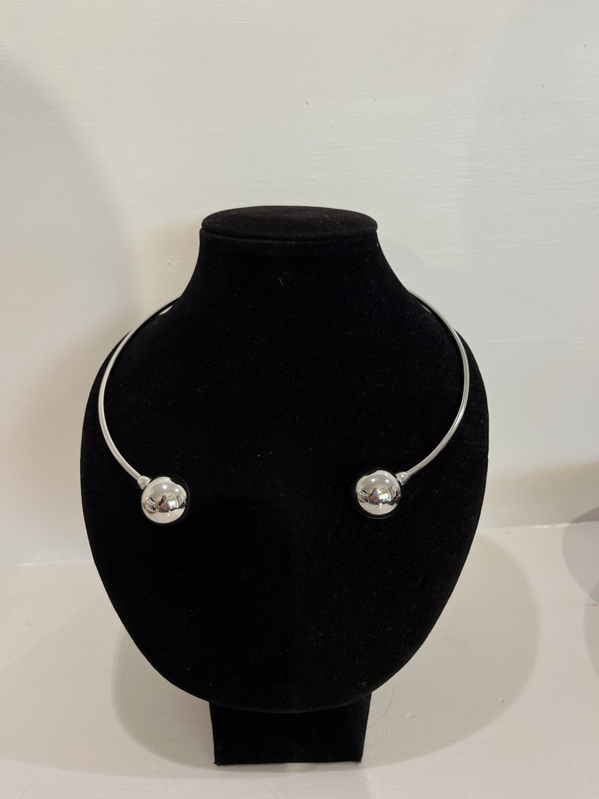 Collana rigida con sfere: minimalismo scultoreo dal tocco elegante.